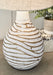 Shine a contemporary spotlight on your good taste with this table lamp. The antiqued white and goldtone finish of the metal lamp adds texture and interest to any space. With a modified drum shade, this light will illuminate your decor with style.